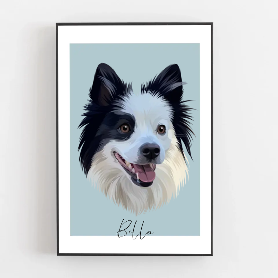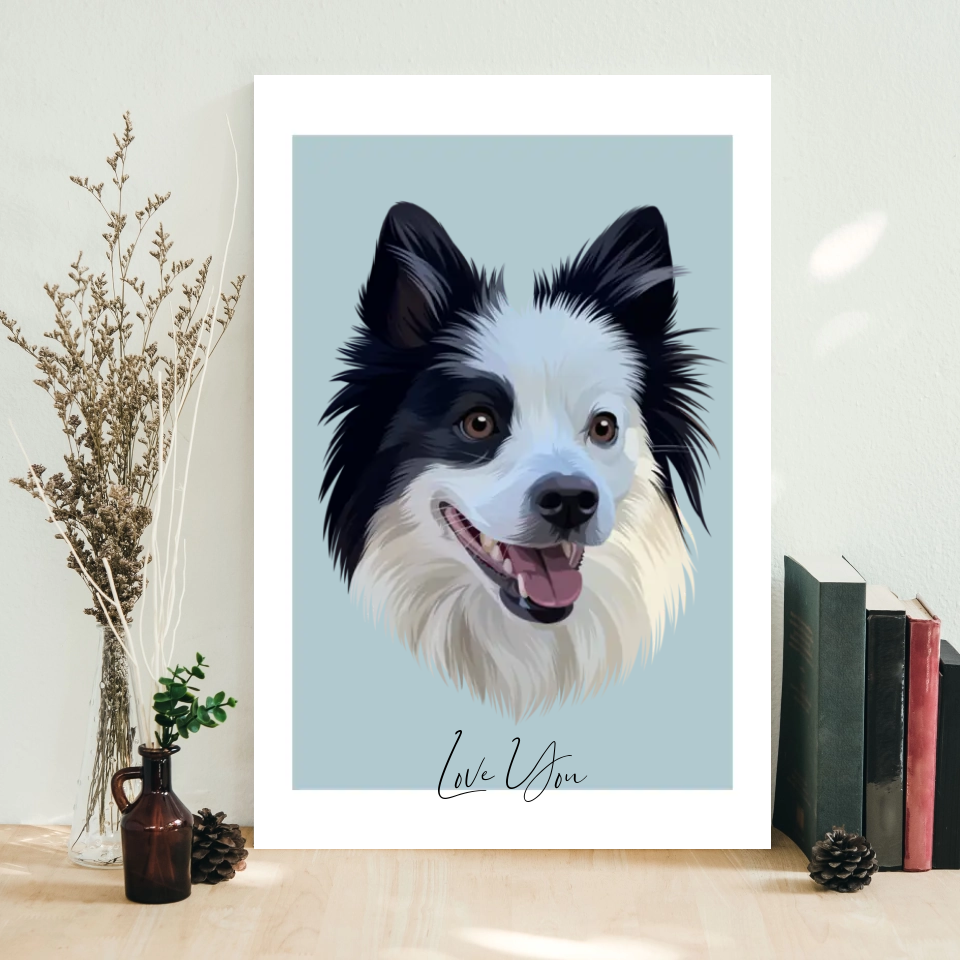 The heart of our personalized posters and canvases lies in the hand-drawn digital portrait, transforming each piece into a stunning work of art. Our talented artists spend time on each creation, carefully choosing colors and styles to suit your pet, and attend to every detail to craft a masterpiece that expresses your pet's personality. Whether it’s a dog, cat, parrot, or another animal, we turn each photo into a unique digital work of art.